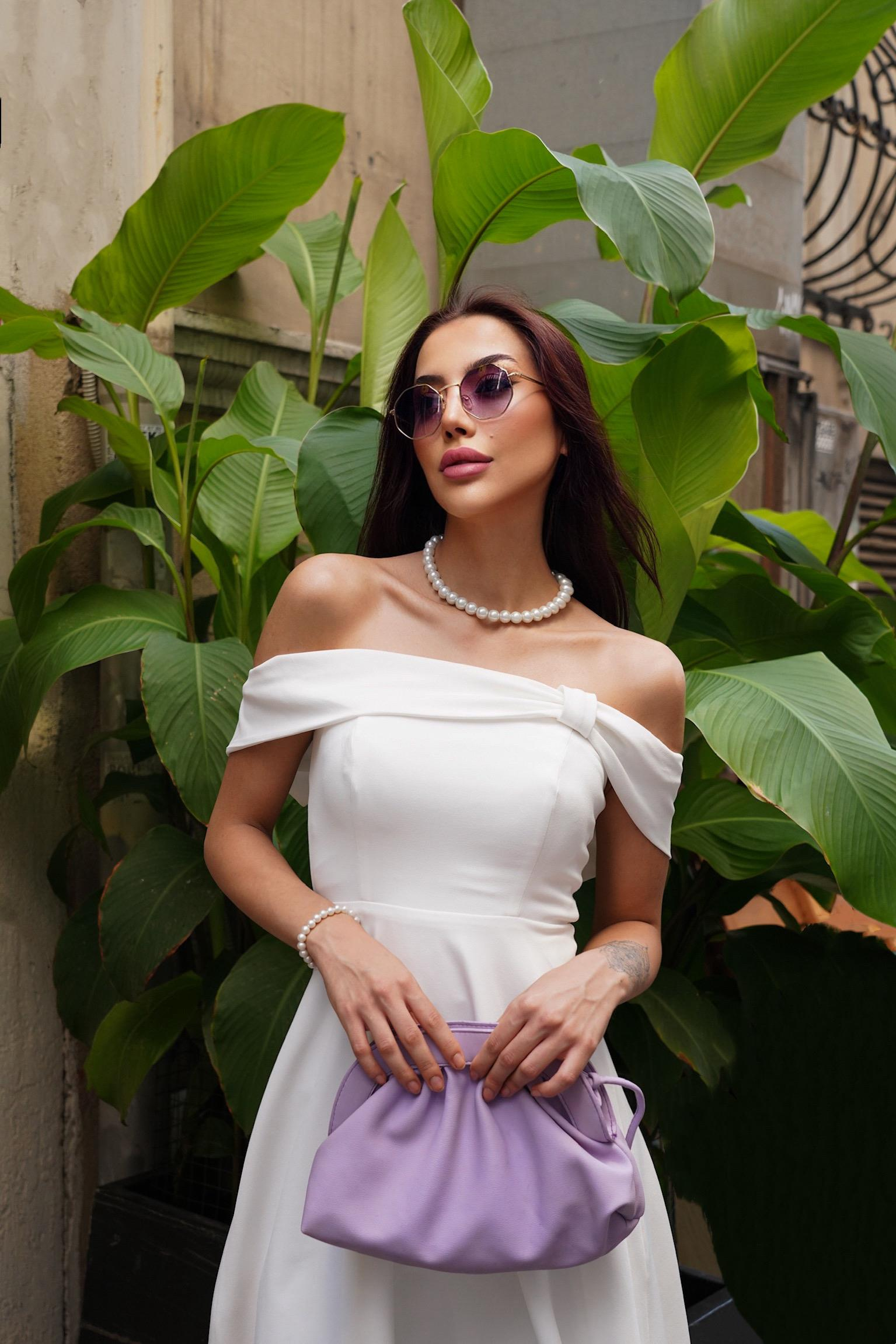 Bu zarif ve sofistike elbise, omuz detayları ve akıcı kesimi ile göz alıcı bir şıklık sunar. Omuz açık tasarımı, zarif bir görünüm oluştururken, A-kesim eteği rahatlık ve hareket özgürlüğü sağlar. Elbise, çift katlı (double) kumaştan üretilmiştir. Hürrem kumaşı olarak da bilinen bu kumaş türü, vücuda tam otururken yüksek kalitesi ve dayanıklılığı ile öne çıkar. Ayrıca, yumuşak dokusu sayesinde konforlu bir kullanım sunar.