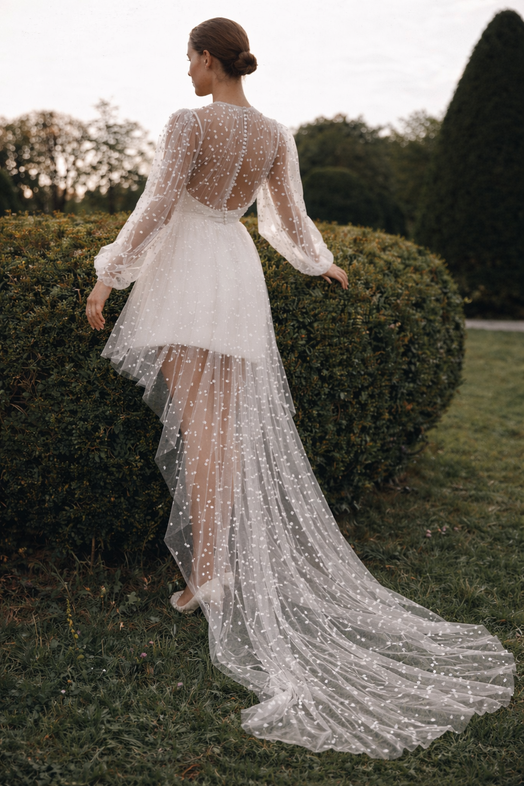 Anemone Mini Söz & Nişan Elbisesi, transparan dokusu ve asimetrik eteğiyle özel günlerde dikkat çeken bir siluet sunar.