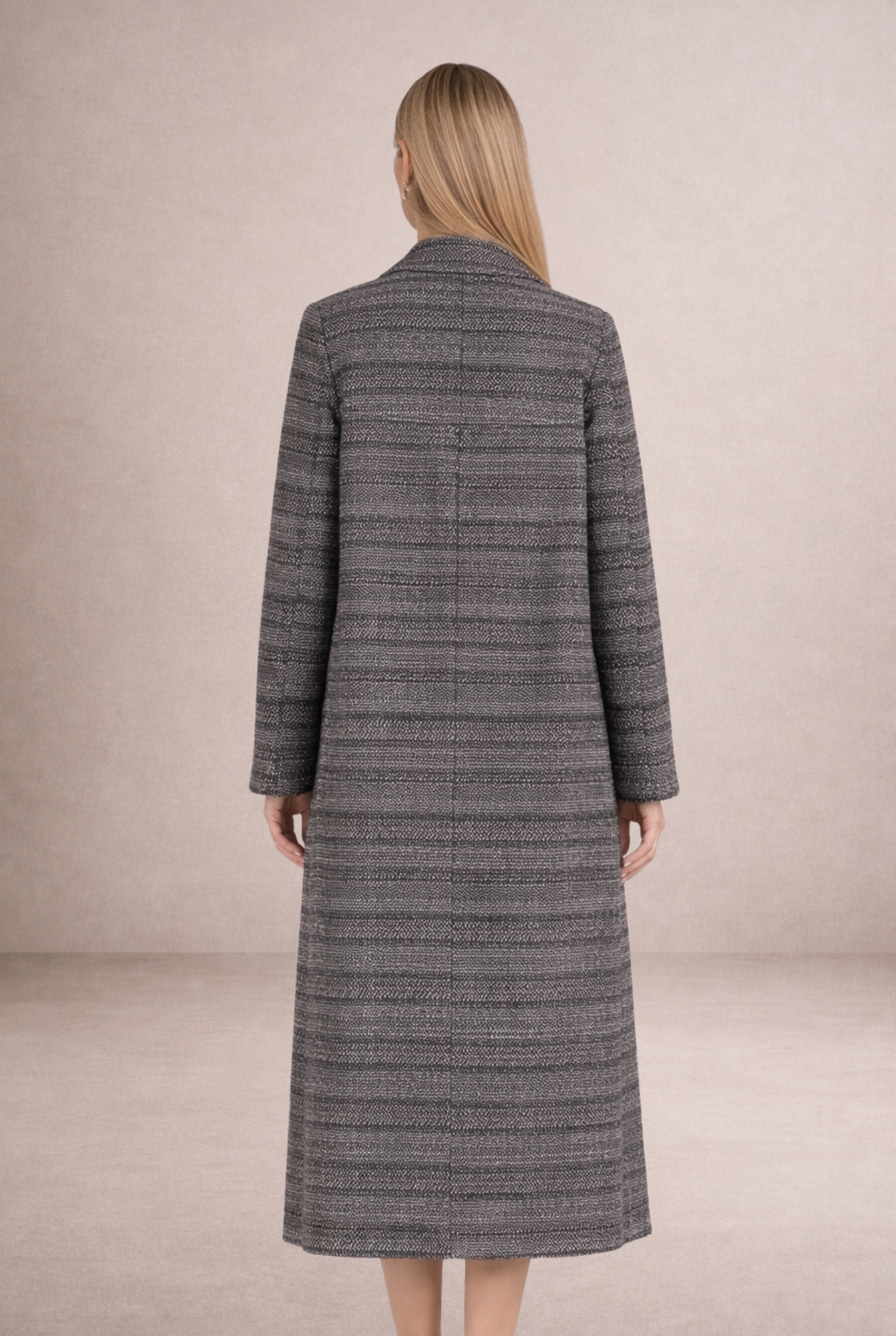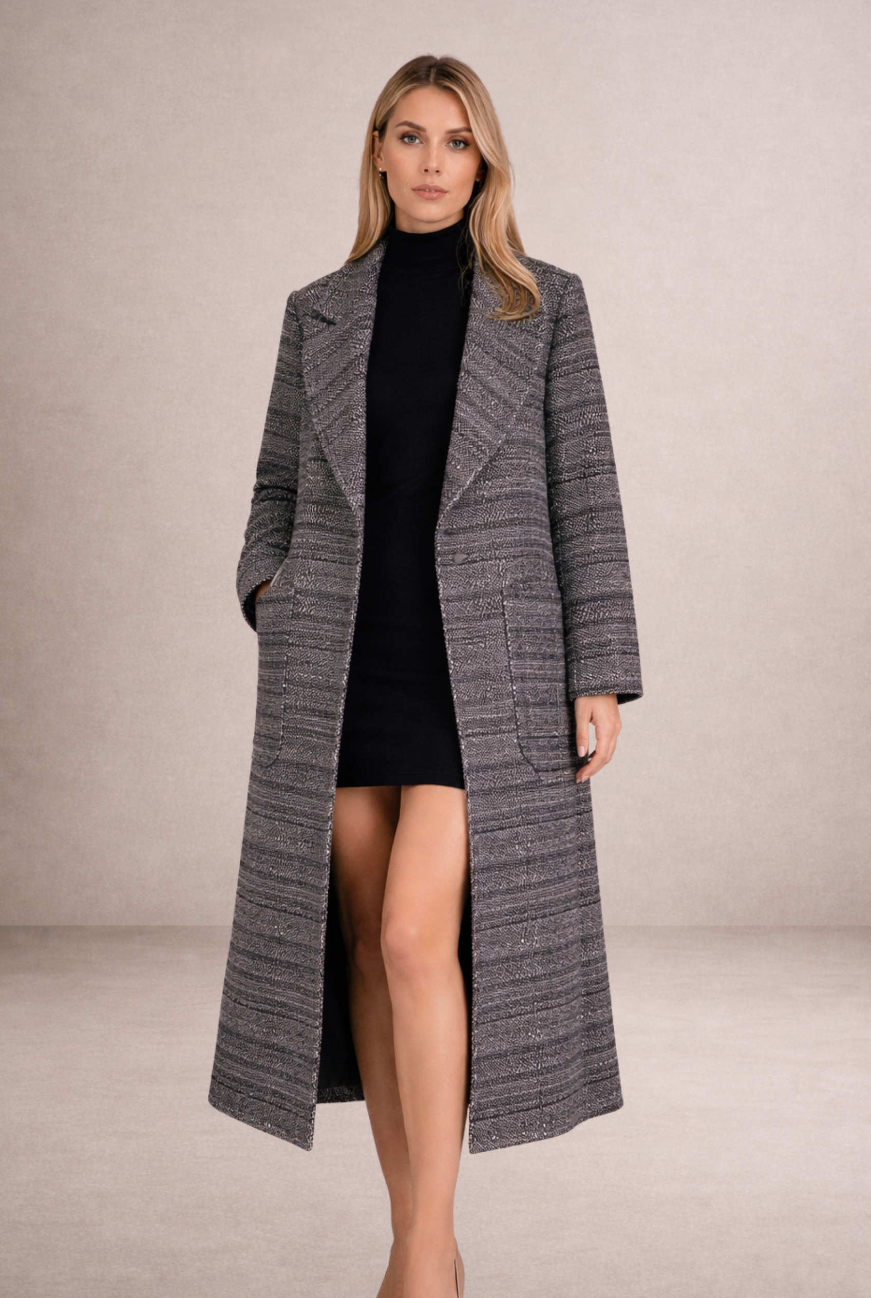 Balıksırtı desenin klasik ve zamansız duruşunu modern bir silüetle buluşturan bu uzun kadın kaban, kış sezonunda şıklığından ödün vermek istemeyen kadınlar için tasarlandı.