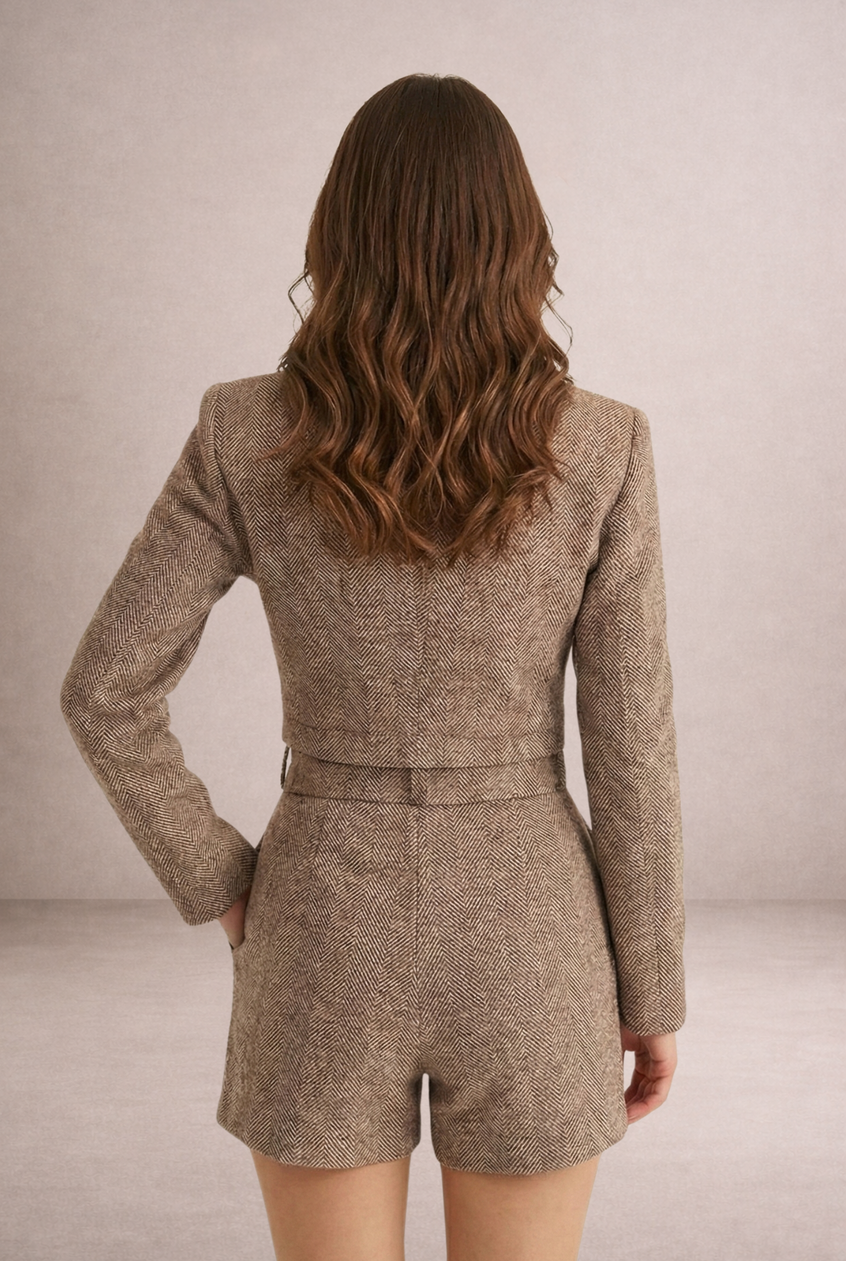 Balıksırtı dokulu kumaşı ve net kesimiyle öne çıkan Calendula kısa ceket şort ikili takım, düzenli ve güçlü bir görünüm sunar.