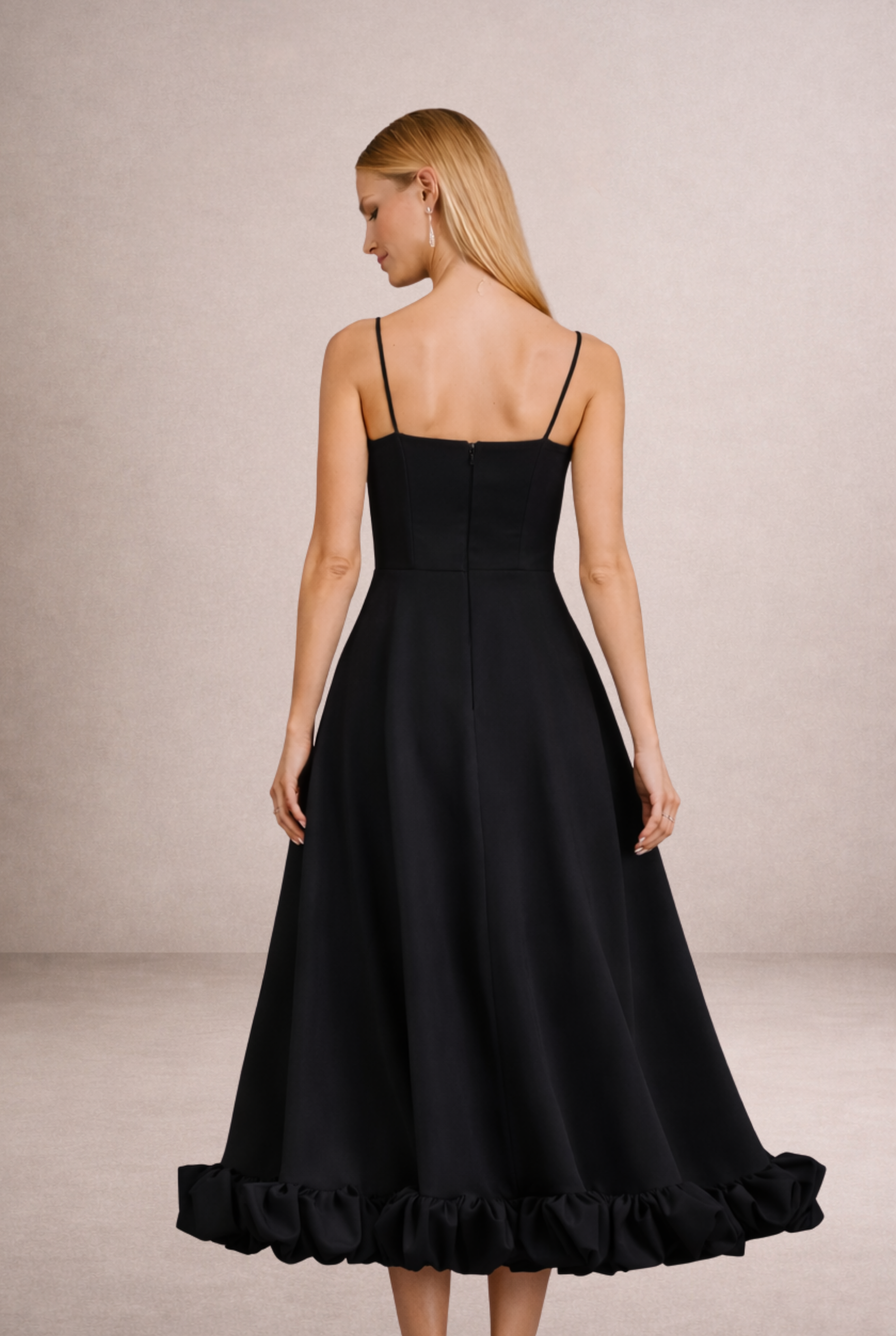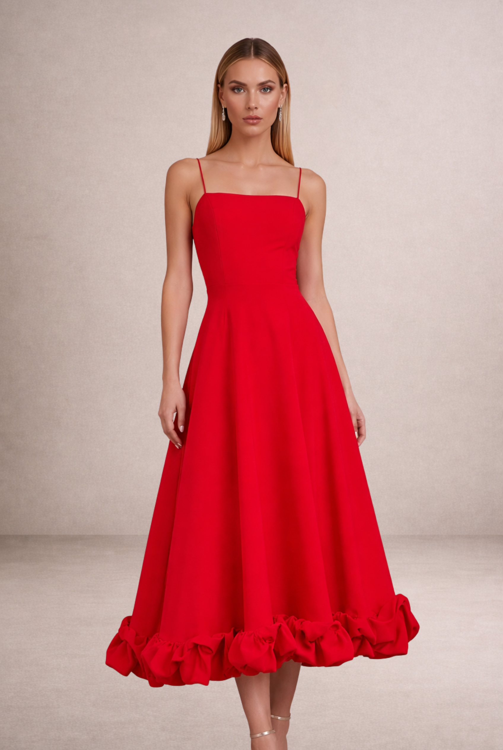 Bu ince askılı midi elbise, volan detaylı etek formuyla zarif ve feminen bir duruş sunar. Kırmızı, siyah, mavi ve beyaz elbise seçenekleriyle farklı davet konseptlerine kolayca uyum sağlar. Midi elbise modelleri arasında romantik çizgisiyle öne çıkan bu tasarım, nişan ve özel gün elbisesi arayan kadınlar için ideal bir alternatiftir. Online elbise alışverişinde hem şıklık hem konfor arayanlar için özenle hazırlanmıştır.