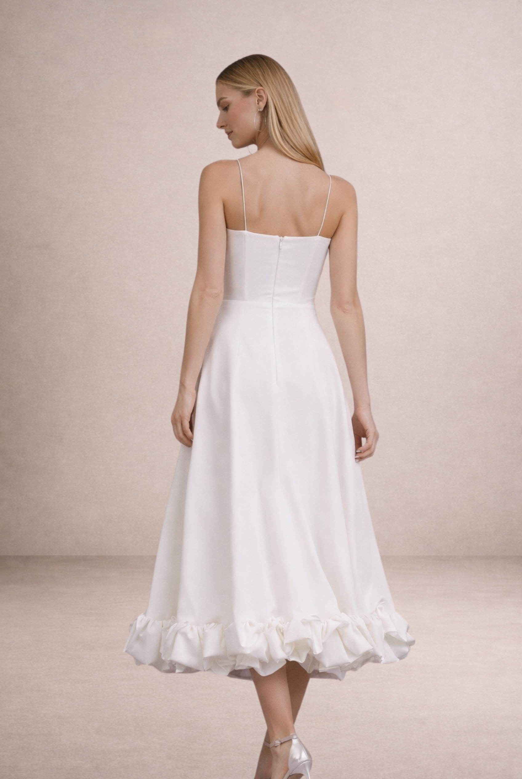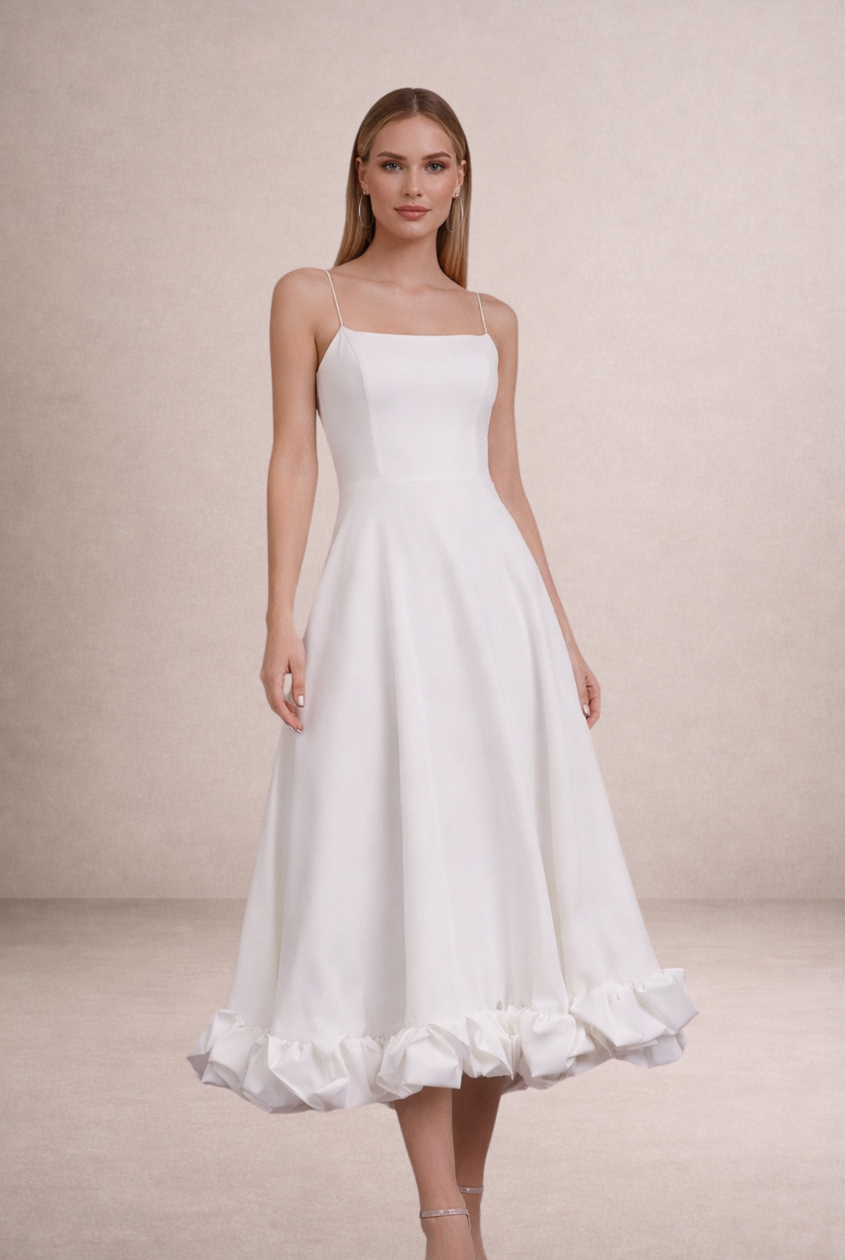 İnce Askılı Volan Detaylı Midi Davet Elbisesi