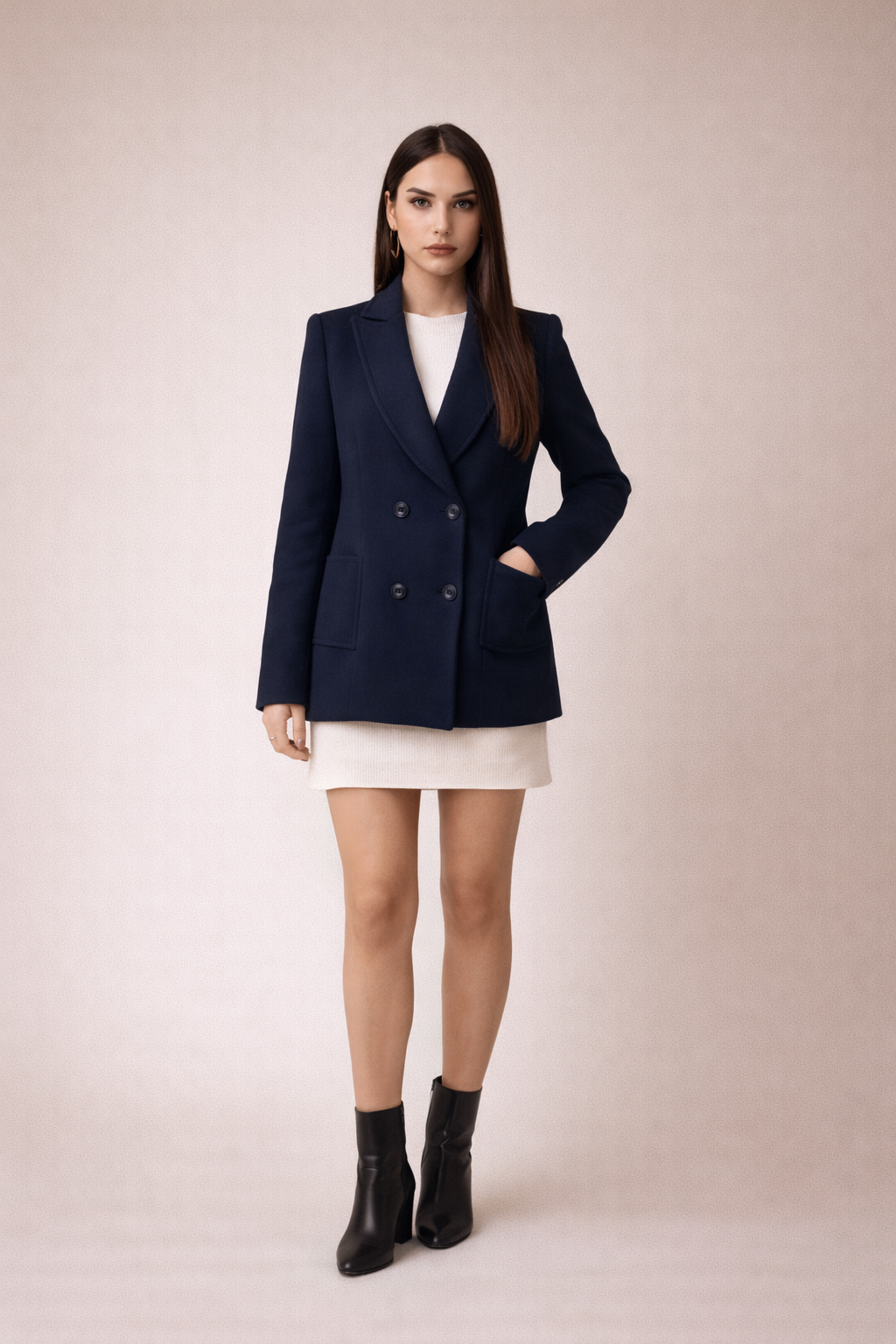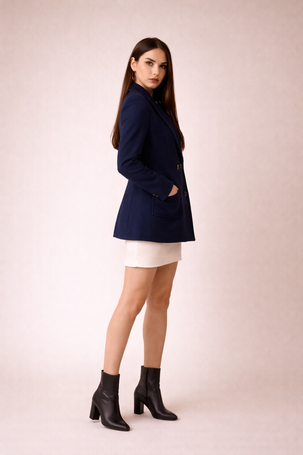 Düz ve net kesimiyle öne çıkan bu çift düğmeli ceket, günlük ve daha şık kombinlerde rahatlıkla kullanılabilecek bir modeldir. Bel hizasında biten formu sayesinde elbise, etek veya pantolonlarla dengeli durur.