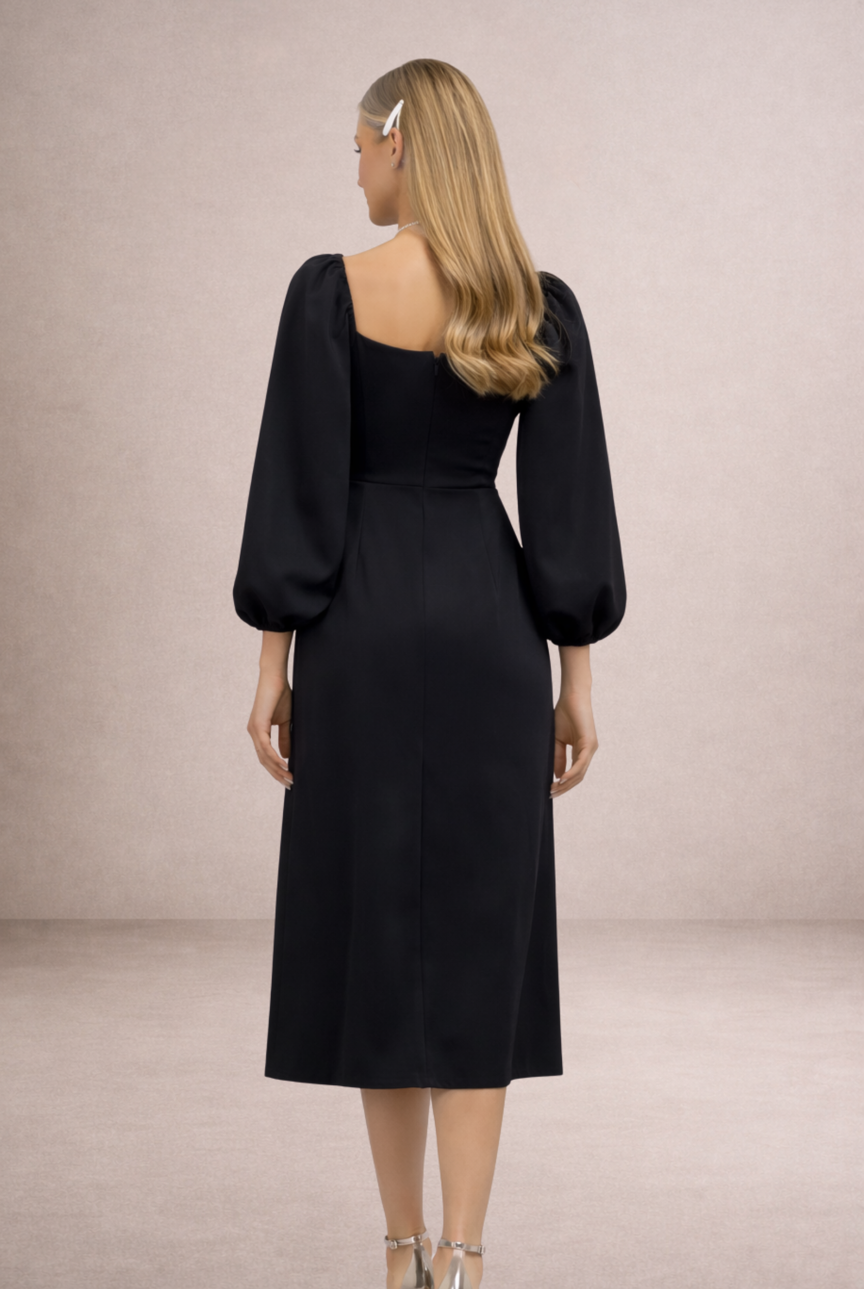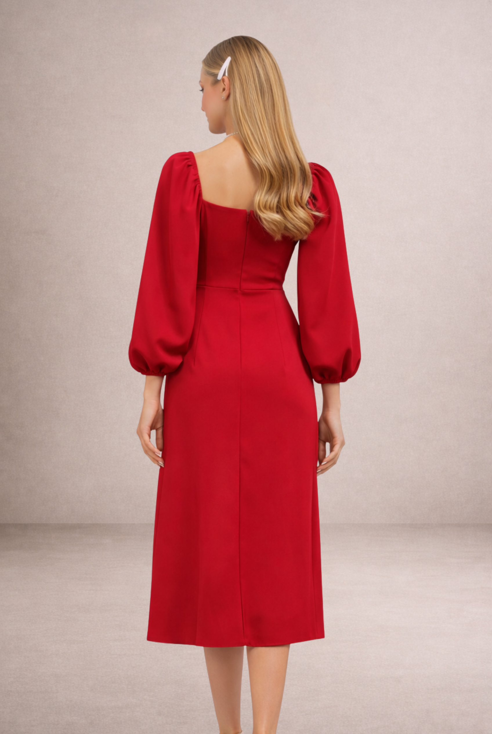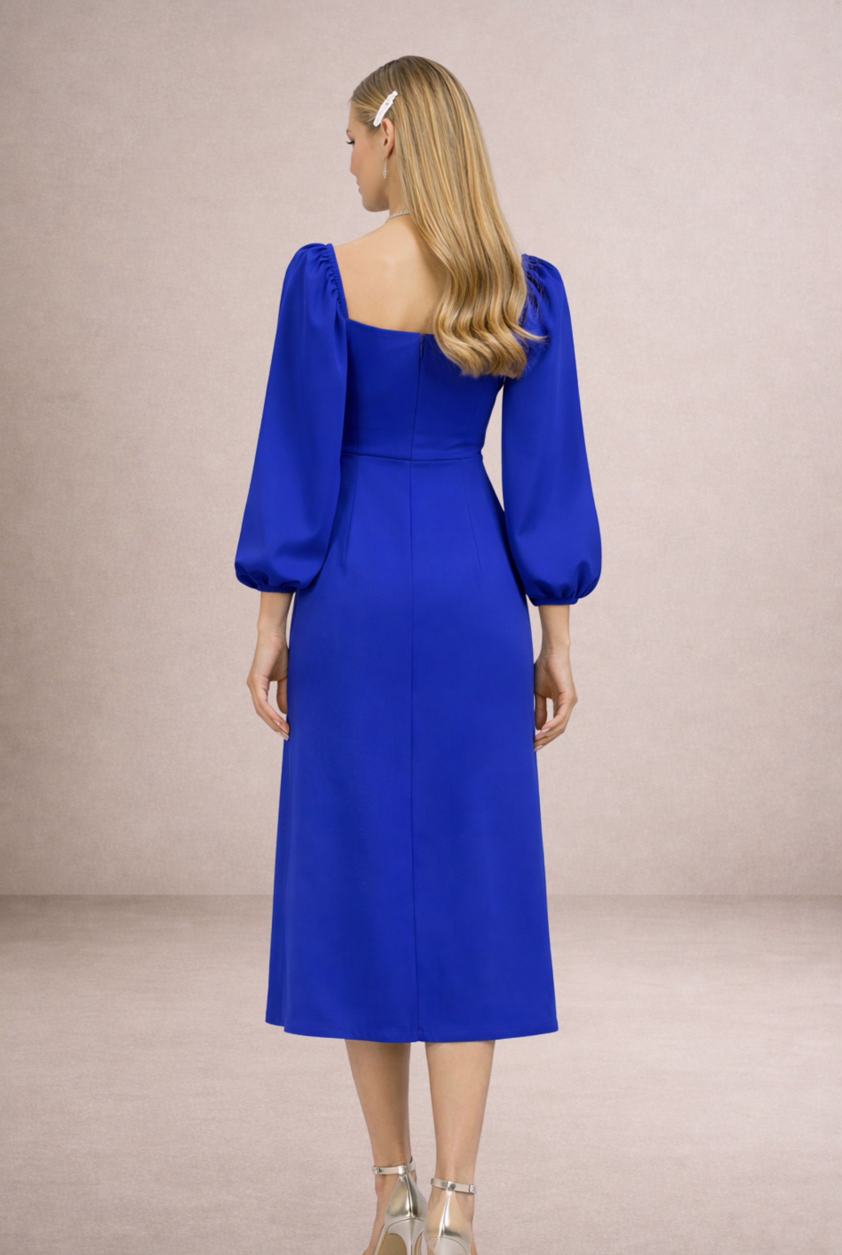Bu kare yaka midi elbise, klasik ve modern detayları bir arada sunan tasarımıyla öne çıkar. Uzun balon kol yapısı ve yırtmaç detayı sayesinde zarif bir silüet oluşturur. Siyah, kırmızı ve mavi elbise seçenekleriyle farklı davet konseptlerine uyum sağlar. Midi elbise tercih eden kadınlar için hem şık hem dengeli bir alternatif sunan bu model, online davet elbisesi arayışında öne çıkan parçalardan biridir.
