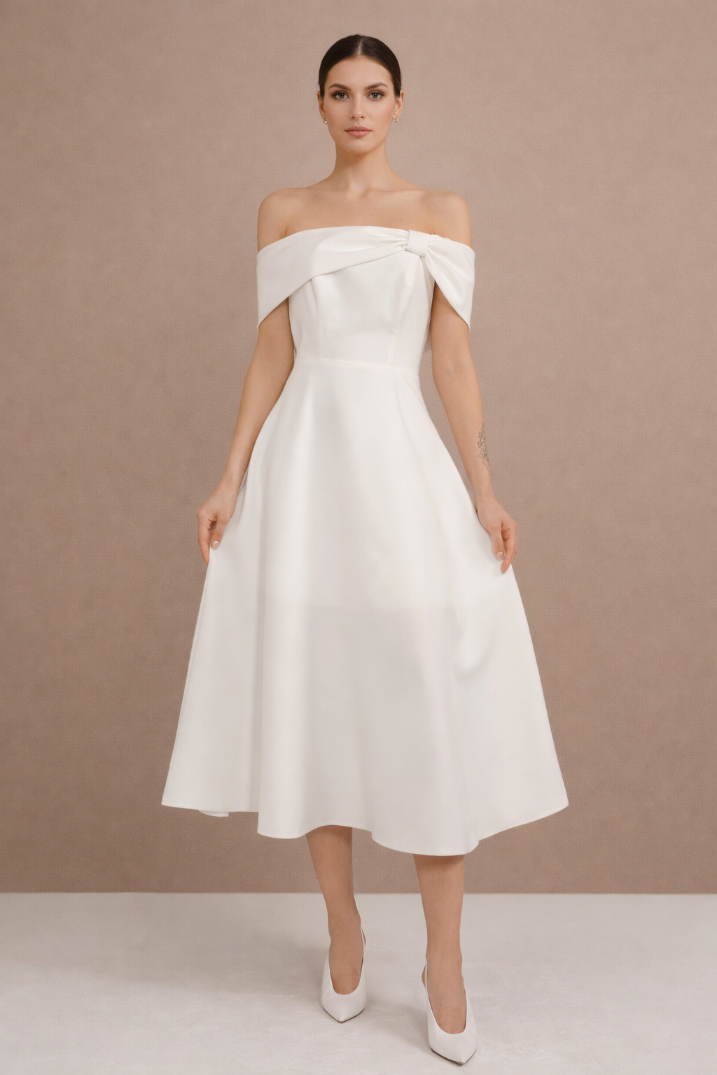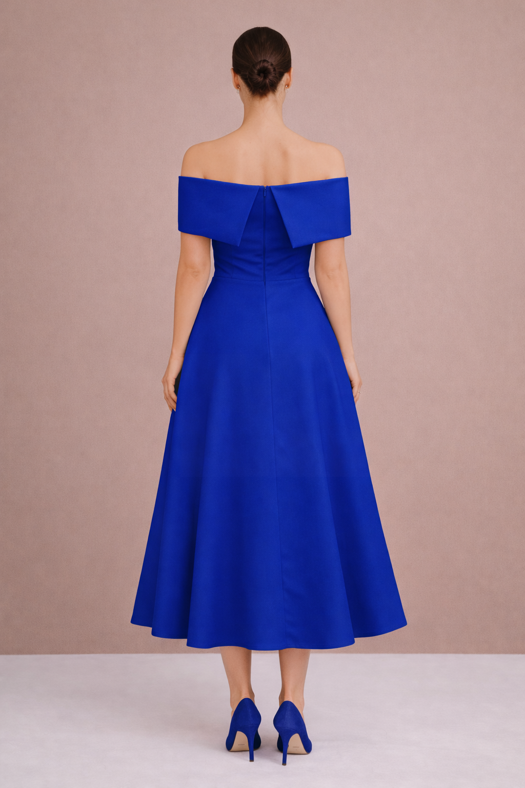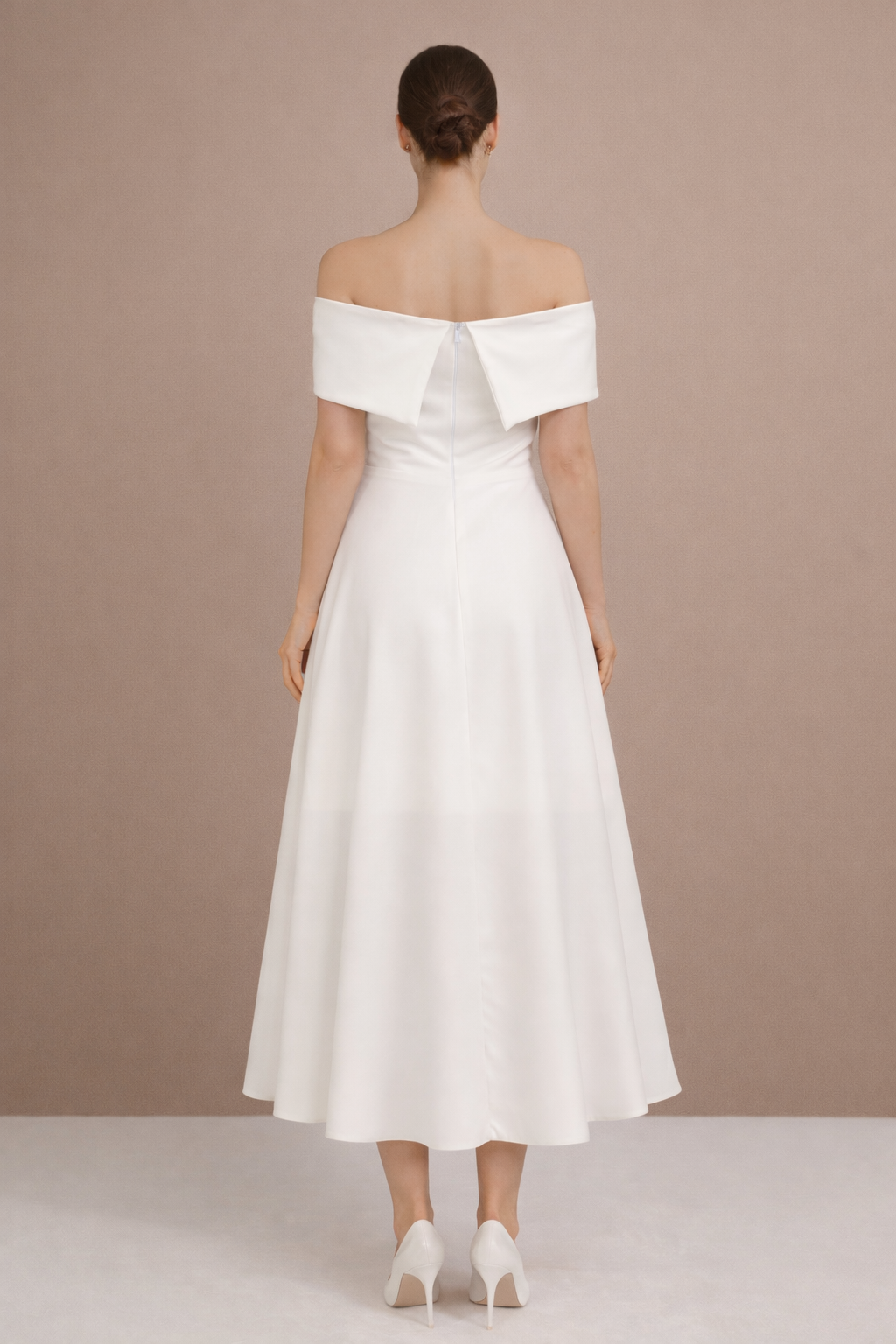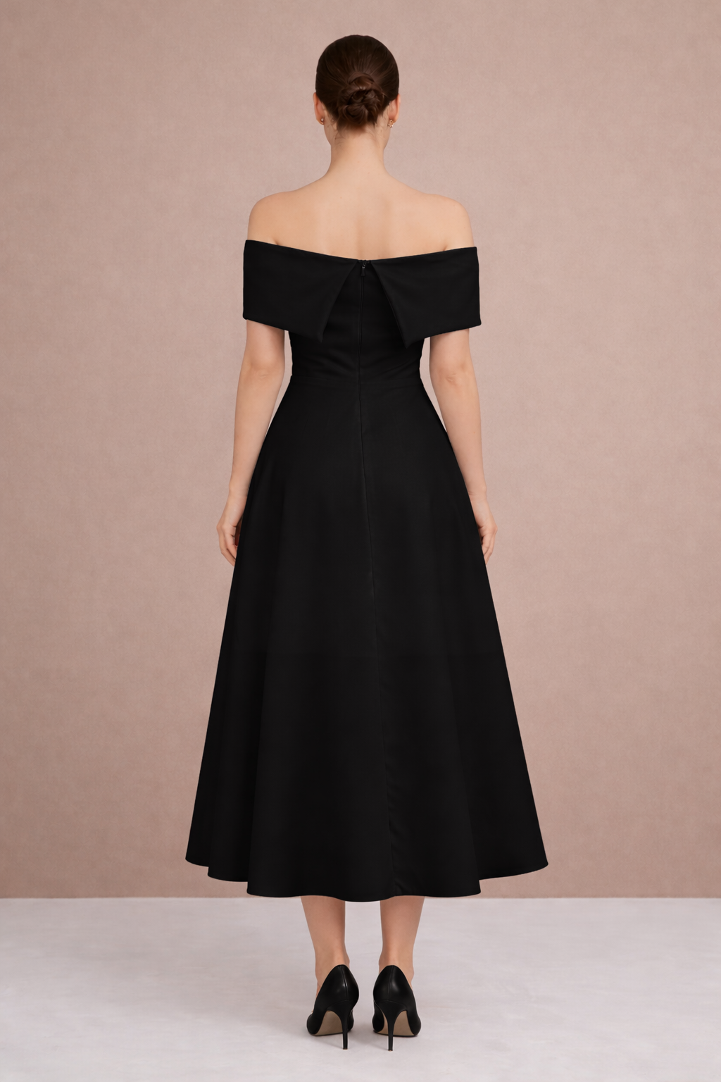 Zarif madonna yaka kesimi ve feminen A-line midi formu ile öne çıkan bu elbise, sade şıklığı güçlü bir silüetle buluşturur. Omuzları açıkta bırakan yaka detayı, boyun ve omuz hattını zarif şekilde vurgularken; bele oturan kalıp ve dökümlü etek formu dengeli ve kusursuz bir duruş sağlar.