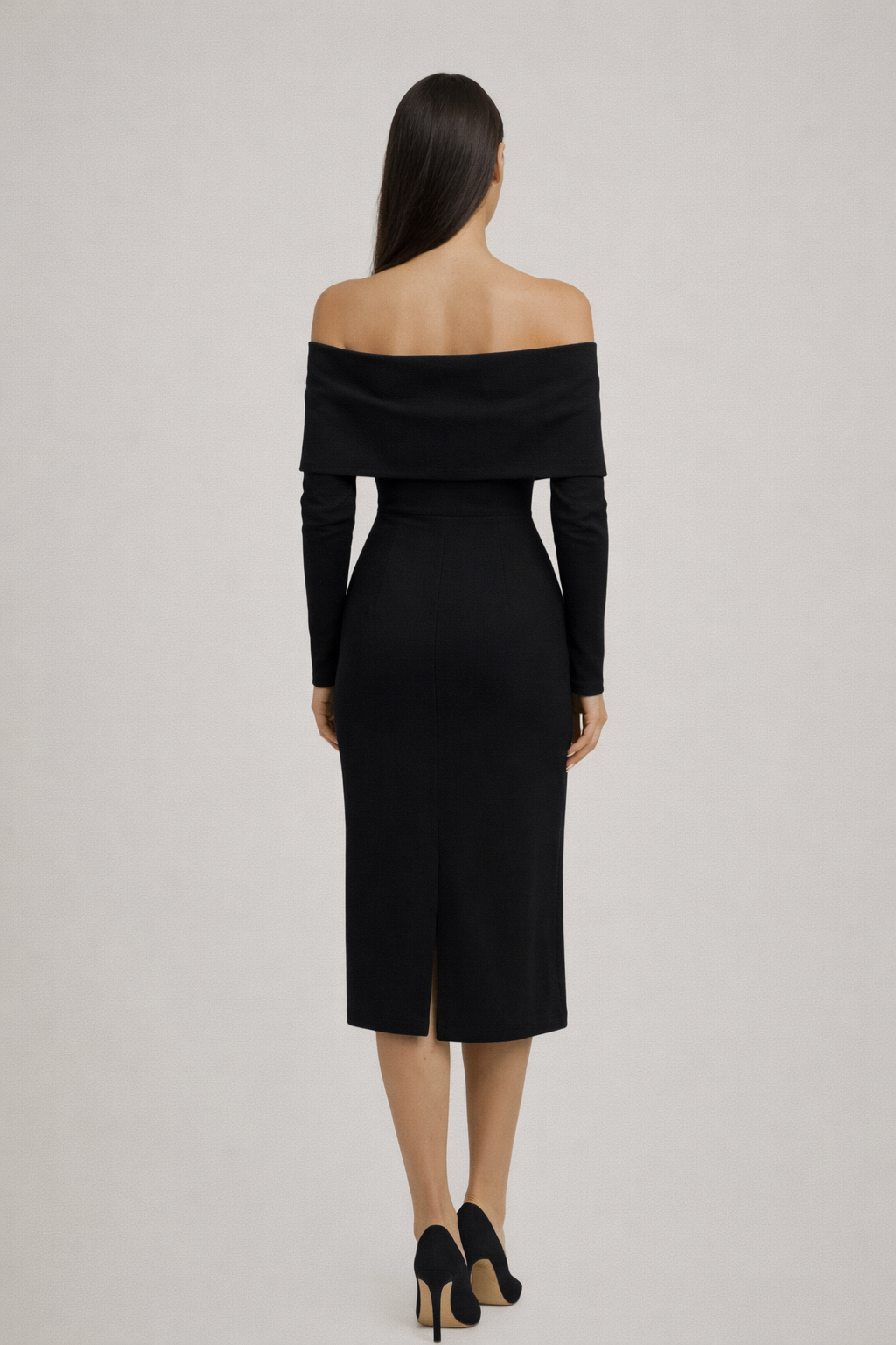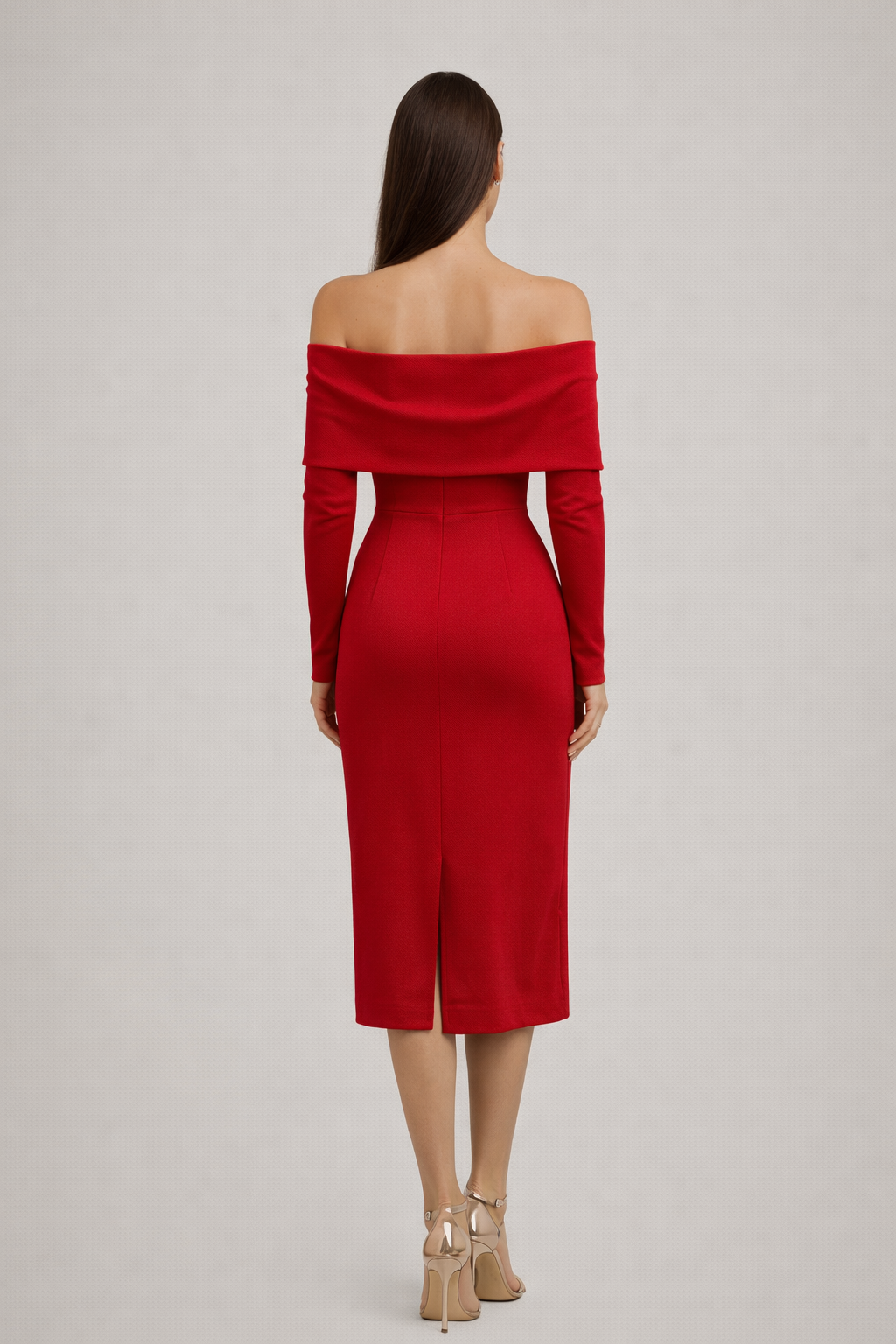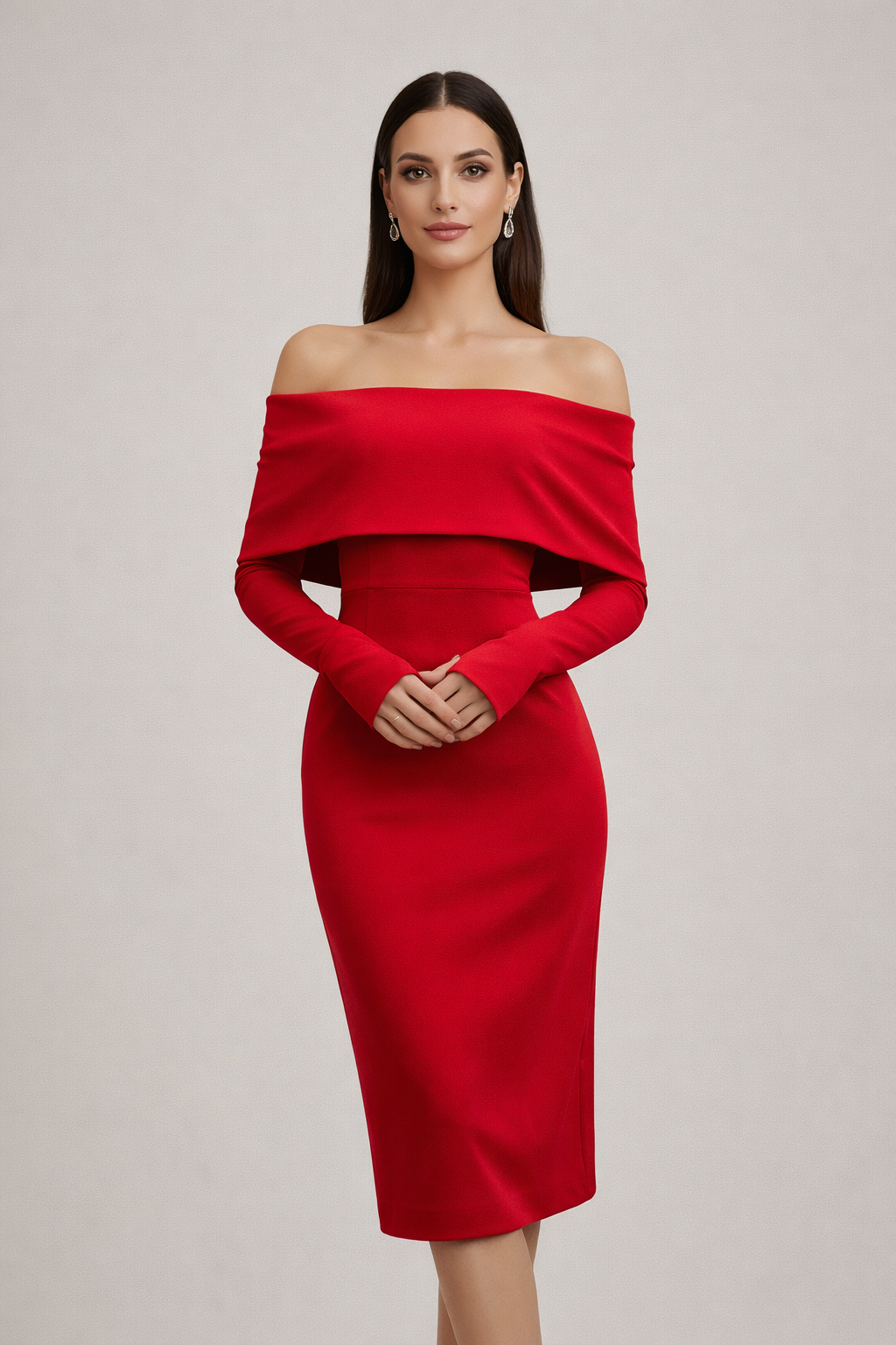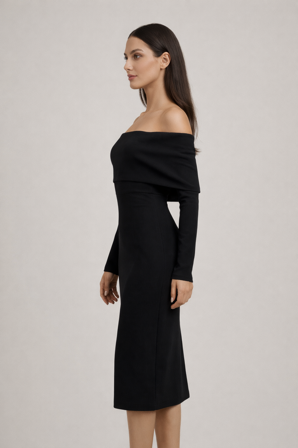 Bu Madonna yaka midi elbise, omuz açık tasarımı ve vücuda oturan kalıbıyla feminen bir silüet sunar. Uzun kollu yapısı, elbiseye dengeli ve sofistike bir görünüm kazandırırken midi boy kesimi davet şıklığını tamamlar.