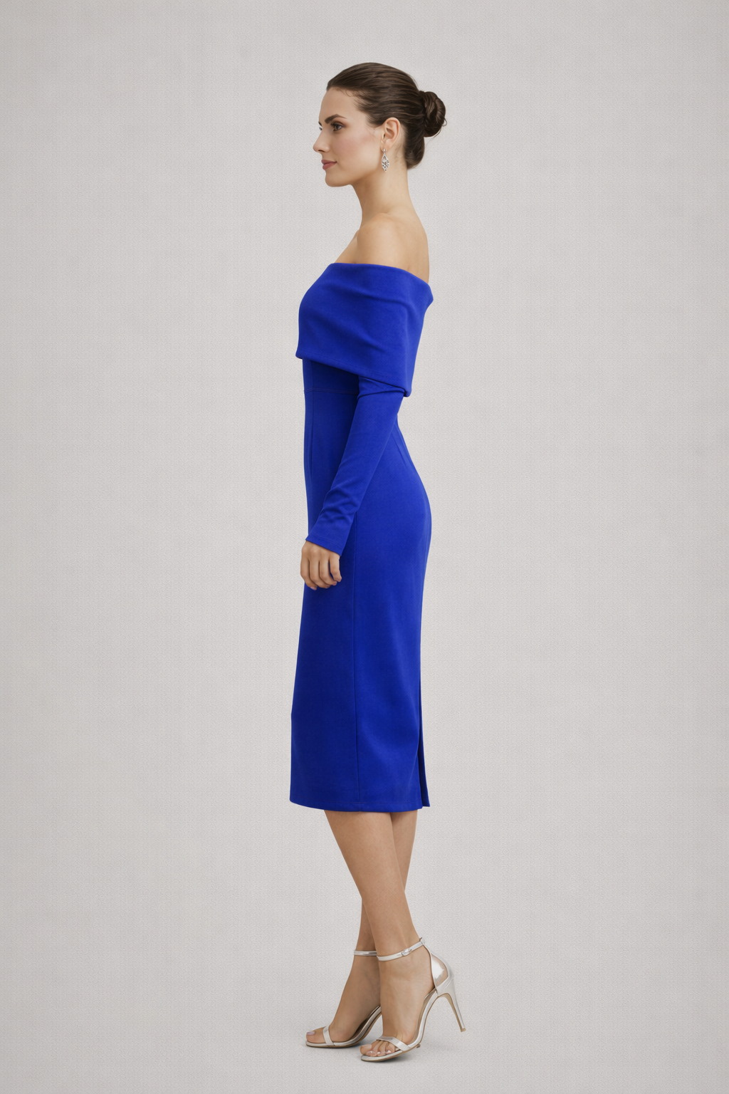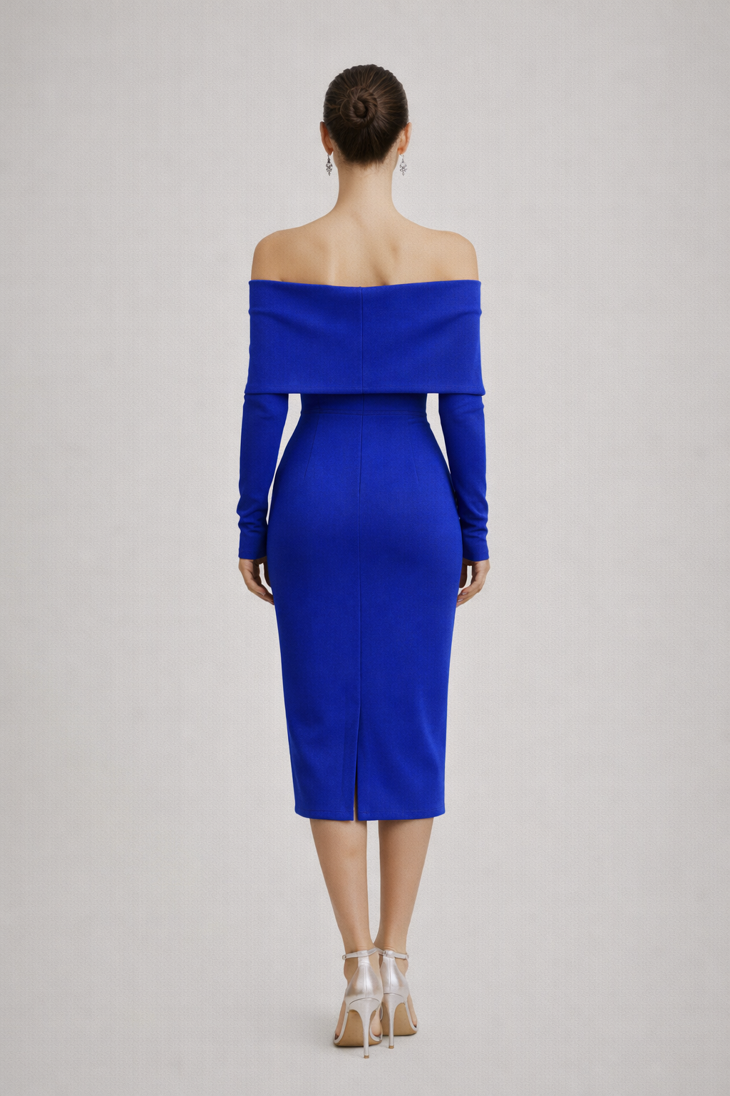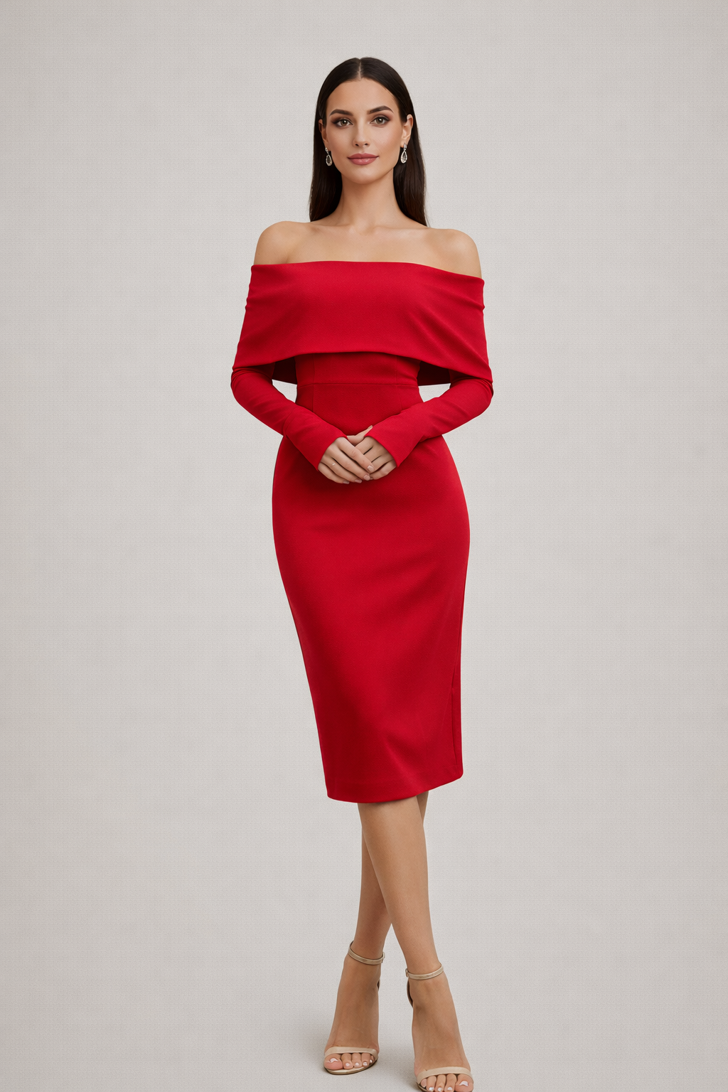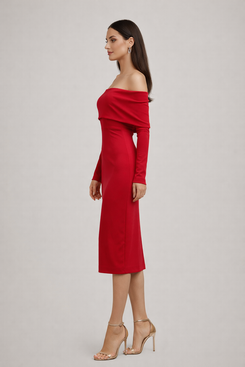 Bu Madonna yaka midi elbise, omuz açık tasarımı ve vücuda oturan kalıbıyla feminen bir silüet sunar. Uzun kollu yapısı, elbiseye dengeli ve sofistike bir görünüm kazandırırken midi boy kesimi davet şıklığını tamamlar.