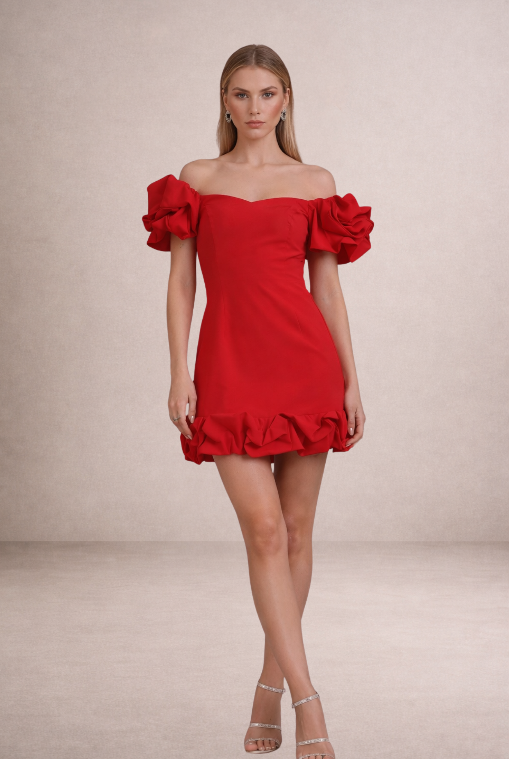 Bu omuz açık mini elbise, volan detaylarıyla hareketli ve dikkat çekici bir stil sunar. Davet elbisesi ve gece elbisesi arayan kadınlar için tasarlanan bu model, feminen silüetiyle öne çıkar. Mini elbise modelleri arasında iddialı duruşuyla fark yaratan tasarım, online elbise alışverişinde stilini ön plana çıkarmak isteyenler için güçlü bir alternatiftir.