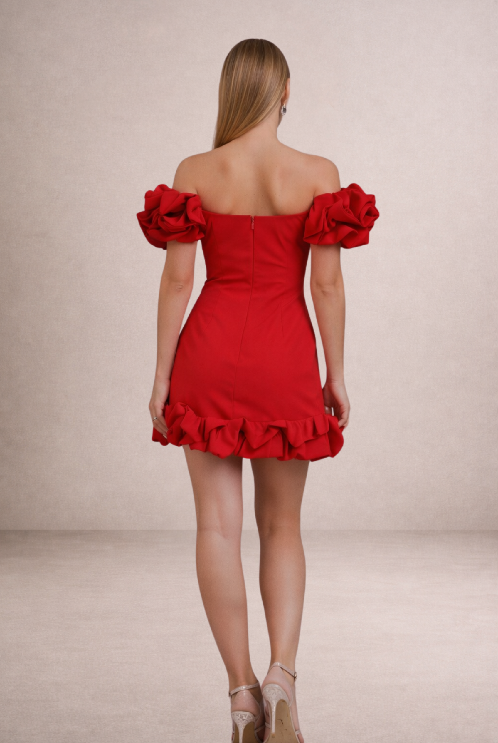 Omuz Açık Volan Detaylı Mini Davet Elbisesi